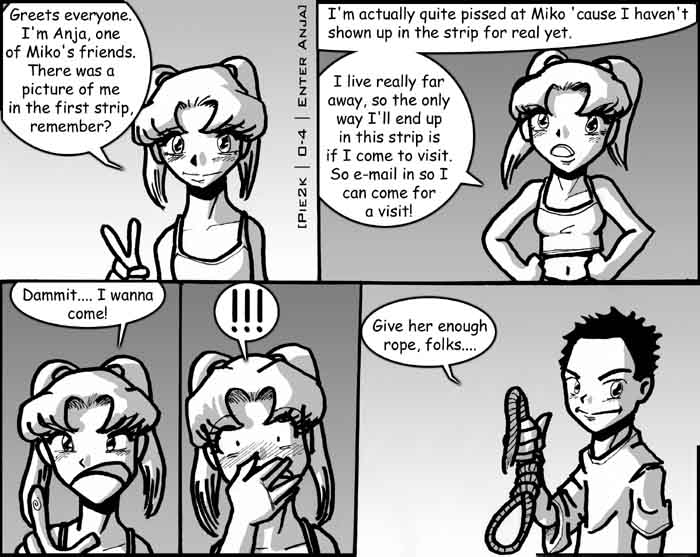 Now we get to the fifth strip and realize that it's not working out that way. Anja is definitely Meg, and Miko is definitely me. Do I have qualms with this? No, of course not. I actually tend to enjoy strips about real-life people (exaggerated a little). Why not make Miko look more like me, Anja more like Meg, and change their names?