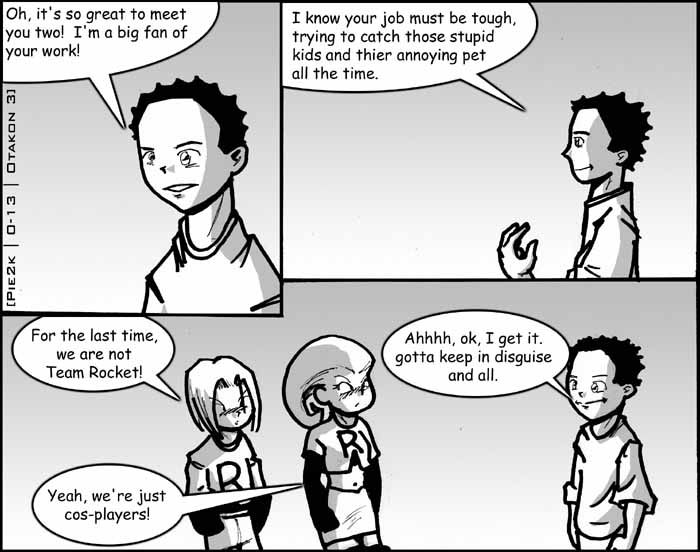 Warning: Blanket statement Cos-players are inherently freaky people. See, the whole concept of showing admiration for a character by dressing up like them is inherently flawed simply because cartoons can get away with significantly more abstract clothing. For example, there was this girl walking around at Otakon in a black bikini, black heels, and a black tail stapled onto her bikini bottom. This was apparently a costume designed to look like a specific character. But when it's worn by a jail-bait 16 year old in a convention full of awkward guys, it just becoms 1 1/2 square feet of bad idea.