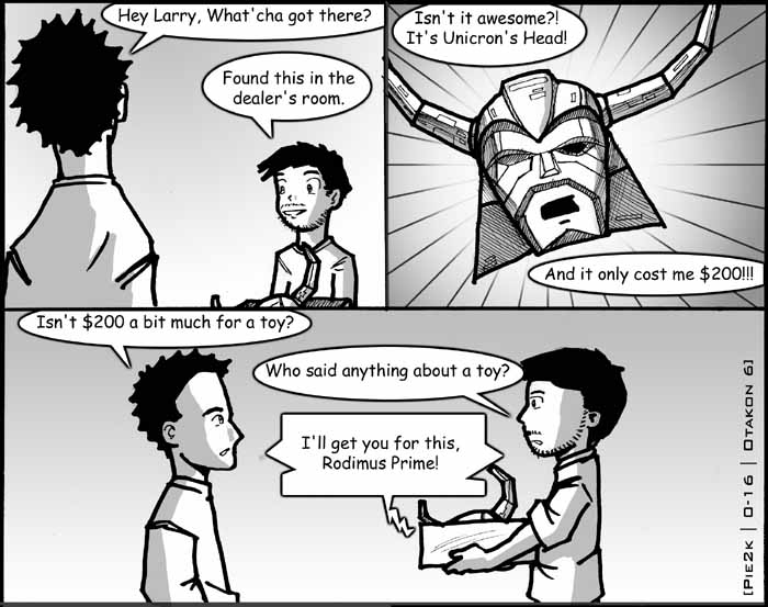 Yeah, um... can you tell that Bill and Larry came over last night and we watched "Transformers the Movie?" It'd been a very long time since I had seen it, so I didn't quite know what to expect. Believe it or not, though, Transformers actually is still a pretty damn good movie (as good as any mid-80's cartoon movie goes at least). Sure, the hair metal seems out of place now, but it's endurable, and the story is actually pretty damn decent... shockingly enough. The weirdest part about the movie, though, is the voice talent, which includes Judd Nelson, Orson Welles, and Leonard Nimoy... all of which are much higher calibur than your typical cartoon voice talent. Even compared to more recent flicks. Take Titan A.E.... Orson Welles vs. Bill Pullman..... Leonard Nimoy vs. Matt Damon? I think it's pretty obvious here.