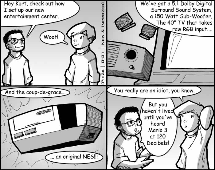 Walking into Bill & Kurt's room recently, I noticed a distinct feel that they really appreciate old stuff. For example, the dual NES and SNES setups (because each system is a little busted, but they play all the games between them). Also of note are the various old computers, such as a K6-2, a P233 MMX, and a PPro200. Bill is a bit of an idiot savant when it comes to repairing old PC's. And when he gets the second processor for that PPro200 system (brining it to a whopping effective 400 MHz) it's really gonna fly.