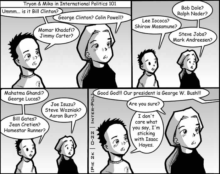 Yeah... um... it's me & Tryon in International Politics. I'm a Comp-Sci major, he's a Theater/Graphic Design major... do I really need to draw it out for you. haha pun.... Getting too sad to go on... signing off now.