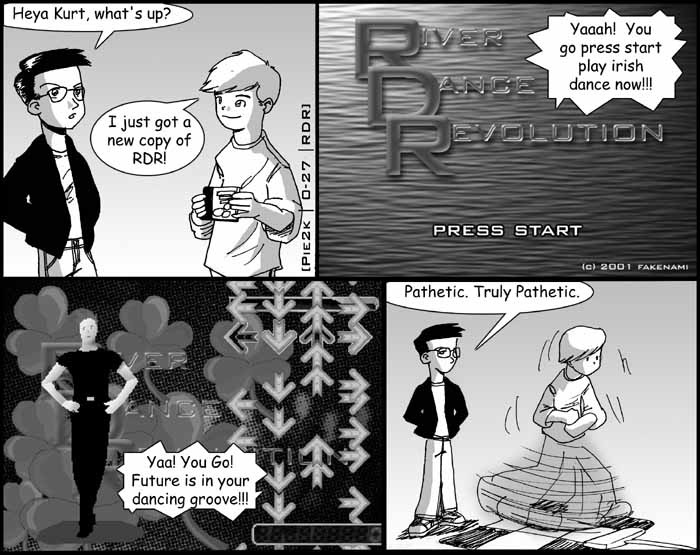 So, yeah, um.., Dance Dance Revolution is sweeping across our campus faster than wildfire, and Kurt is our local guru. I asked him one day to consider what River Dance Revolution might look like and he just chuckled and said something along the lines of "I'd probably play it." So all I have to do now is to take those mock-up screens and learn how to program on a PlayStation and he'll have his wish.