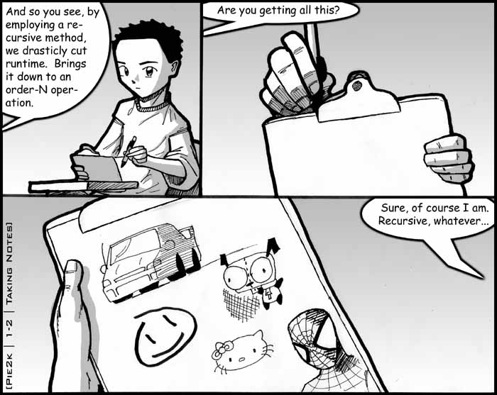 Now, I could put an excuse for why I waited so long here (mostly consisting of the same old "I hate work" routine), but I'm sure you don't wanna hear it. So I'll tell you what you wanna hear, that I promise I'll get some new Pie2k up soon. Also I'll be adding some drawings and programs to the "Other Projects" section. For those of you who haven't looked at it yet, the stuff in Other Projects is pretty neat, including a bunch of pencil sketches, some renderings, and a program entirely devoted to displaying Hello Kitty on your screen.