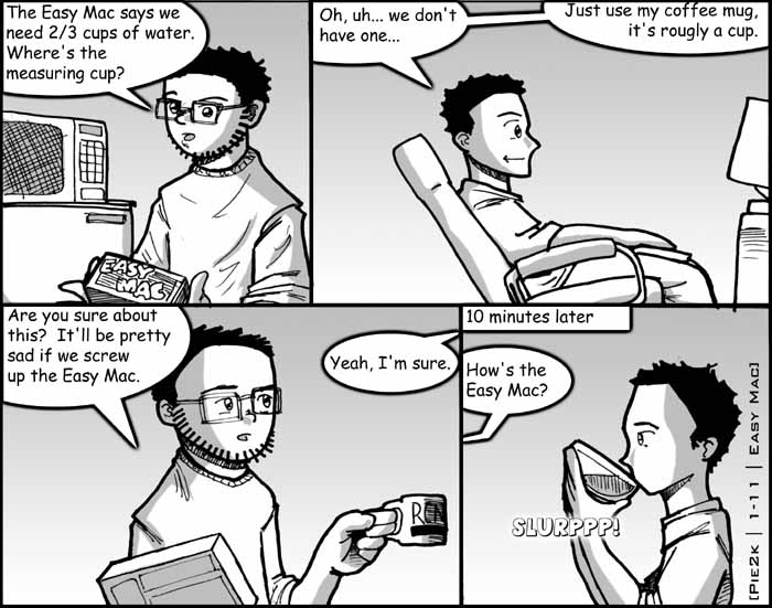 Anyhow, the one thing that gets me about Easy Mac is that it's supposed to be incredibly easy, but it requires a measuring cup. Relatively speaking, it's not that easy at all. I mean, if I want really easy Mac & Cheese, I can just buy it in a can, à la Chef Boyardee. Or, I could even buy it frozen, like in a Hungry Man or something like that. So there are at least easier ways of making Mac & Cheese.