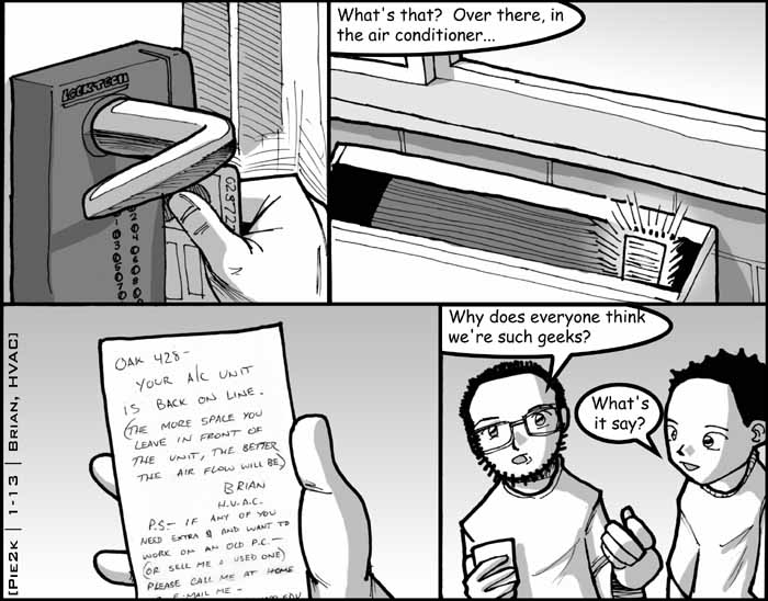 I don't know what could've prompted Brian HVAC to contact us, except for maybe the 5 old computers we have stacked up on our shelves because we have no freaking clue what to do with them. The ultimate irony to this, though is that Brian HVAC would never have ended up in our room if we hadn't killed the A/C unit by having Bill Muller here for a big computer fixing session where we got 3 working and junked 3, and also played with the suns for a while. When you have that many people and that many computers on at once, the A/C doesn't stand a chance.