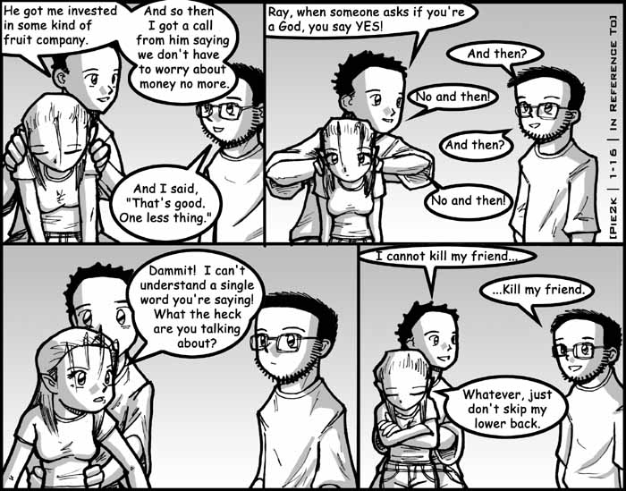 Bill and I speak like this a lot, often just quoting a movie or a TV show to express what we're thinking. When Kelly came over about a week and a half ago, Bill and I had been living together for about 3 weeks and were pretty much making the same references all the time. It was like our language. And then, as I'm rubbing her back (she's a glutton for back rubs, really... not that I mind giving them :) ), and as Bill and I are making dueling Strongbadia references, she's looking at us like we've each got 2 heads. So Bill fired up the Stronbad e-mail about Flag Day and Kelly now understood, but thought we were loonier than she did before. Oh well, at least it can't rain all the time.