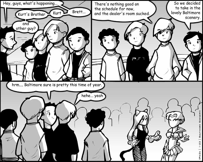I would be so shallow as to so blatantly objectify women in my strip. Hey, a lot of these cosplayers wear tight/revealing clothing to show off their bodies. Guess what? I noticed, and I was resonably impressed. This year there seemed to be a sharp increase in the amount of cute girls cosplaying in tight or revealing clothes. This can be attributed to: A) the 1000 attendee increase from last year, and B) the significant decrease in Kenshin / Shinsengumi cosplayers (freeing up many cute girls from wearing loose form-concealing clothes).