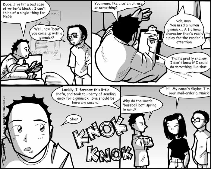The second issue is that the characters often look very alike. Bill and Larry looked similar (sans glasses). Jeremy and Bill looked the same when they were first introduced (though I am slowly remedying that). But that's how my friends look, pretty normal. Maybe I'll hammer down some character sheets, get some specific looks down on paper for reference... make notes... look professional. Simply put, the character continuity issue is one of the most difficult ones I've seen... and one I avoid like the plague or even an abortion debate.