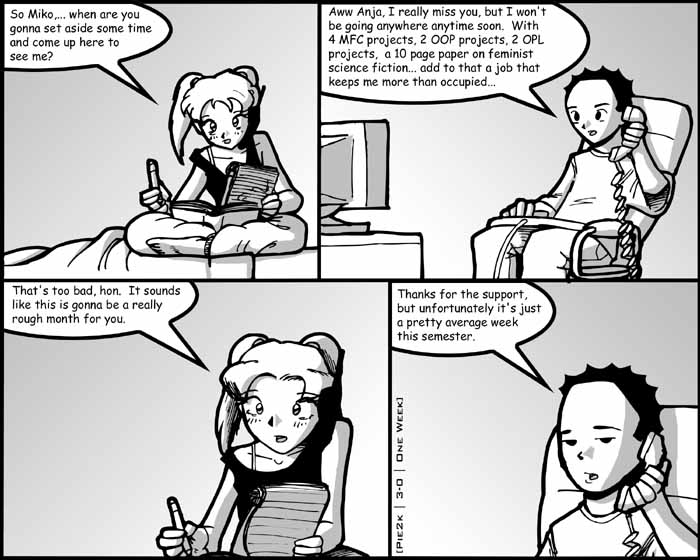 I'm very happy to put Meg's alter ego Anja back in the strip... she's been gone way too long. It's been too long since she and I have seen each other, but we're both busy people without our own transportation. I think it's was either spring break or even Tryon's last birthday the last time we spoke in person. To say the least, I'm a little saddened by that. I miss Meg a lot, and it's not just because we used to go out, either. I miss conversation... I miss her cheesy sick jokes... I miss the way she smirks when she's trying not to smile... I miss her very presence. When you look her in the eye, you see her searching yours with intent interest. I don't think I'm totally alone on this. I have conversations along the lines of "You've met Meg, right?" "Yeah... I met her for about 5 minutes, she's awesome." Katie's a fan, and the two have never met. So I'll wrap up my mini ode-to-Meg with I miss you, and I hope I never take your boundless love and friendship for granted.