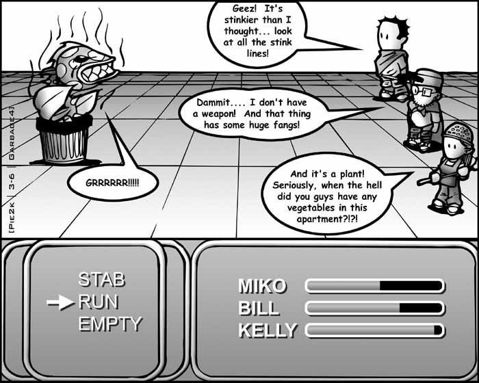 For those of you concerned, we still don't have any heat in our apartment. It seriously isn't any more than 40° in here,... so Bill and I are going to go to Residence Life and bitch them out royally. Well, I'm gonna get some sleep. Short rant, deal with it. I'll try to get another comic up ASAP, blah blah blah. (that's my tribute to MacHall, but in all fairness they've been having server problems, on top of starting classes. I'm sure when I start classes next week I'm gonna severly drop off. Well... stay consistently infrequent at least.