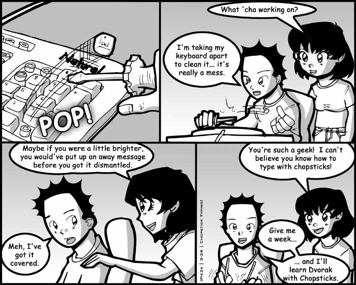 Okay... so how much of this is true? Beth wasn't there, my keyboard was only half dismantled when I put up the away message (so it was left hand + a screwdriver), and I probably have no aptitude to learn Dvorak.