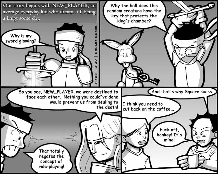It's no secret that I'm not a fan of Square. It's something about the games they make that I really really hate. I think The Bouncer pretty much sums up my opnion of Square. Beautiful art, beautiful graphics, reasonable sound, but nothing more than a new set of character-building rule systems that do little to prop up an archaic dying gameplay model. And why rant about it now? Well, with Penny Arcade, Mac Hall, Megatokyo, and Something Positive all talking about gaming in some form, I just naturally thought about how much I really despise Square. Fuck Square.