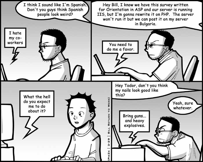 Of course the downside is that he's gotta work at the student center with a bunch of people that weren't there when he left. As it turns out, they're some of the flakiest people that Pat's ever hired. Apparently they get their jobs done just fine (thereby making them far from the worst employees), but they act like idiots the whole time, and it was pissing Bill off today. So, here's an excript of the AIM conversation that led to this comic strip:
