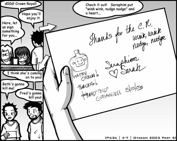 Well, I guess this rules out anyone else laying claim on the Crown Royal bottle. :P Seriously, this is starting to become a tradition since Bill & Jon decided to give Largo a bottle of Bombay Saphire. Now Jon, Bill, and I are trying to decide what liquor to buy for who next year. Basically, if we like your comic, you should come to Otakon next year as there may be free booze in it for you. Ian & Matt could be in for some booze. Maybe Tycho & Gabe. Maybe Terry. We would love to do something for Ian J., but he's not gonna be of age by next year. Maybe since he's a relatively new college student, we'll get him a bunch of Bawls or Jolt or something similarly caffinated.