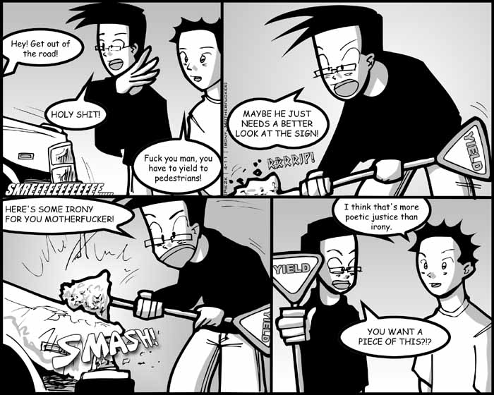 This one is based on a semi-real event. Commie and I did actually almost get hit by a SUV while crossing the crosswalk from the campus to the Village, but it really just resulted in a stream of profanity from the both of us.