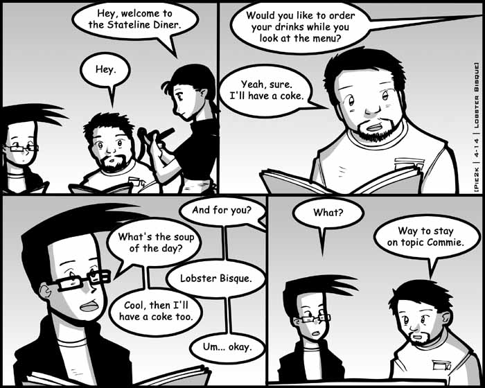 This happened quite a while ago actually, and there was a bunch of us there. But I didn't feel like drawing them all, and since Commie and Bill are really the critical players, I let my laziness take over. It was really one of those "you had to be there" things, but there is actually some reasoning behind this. Commie had limited funds, so if the soup sucked, he would've splurged on a milkshake. If the soup was good, he would just get a coke and a bowl of soup later with his meal. Turned out the soup was good, so he got a soda.
