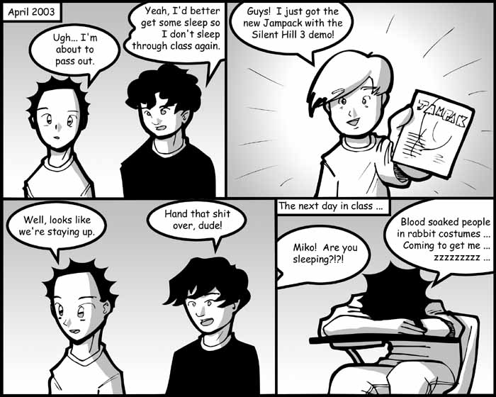 Like the strip? I actually found it while I was cleaning up. Apparently I drew it while I was watching project presentations in Senior Project. That really was the scene when Kurt came home (at like 1 AM) with the new Jampack.