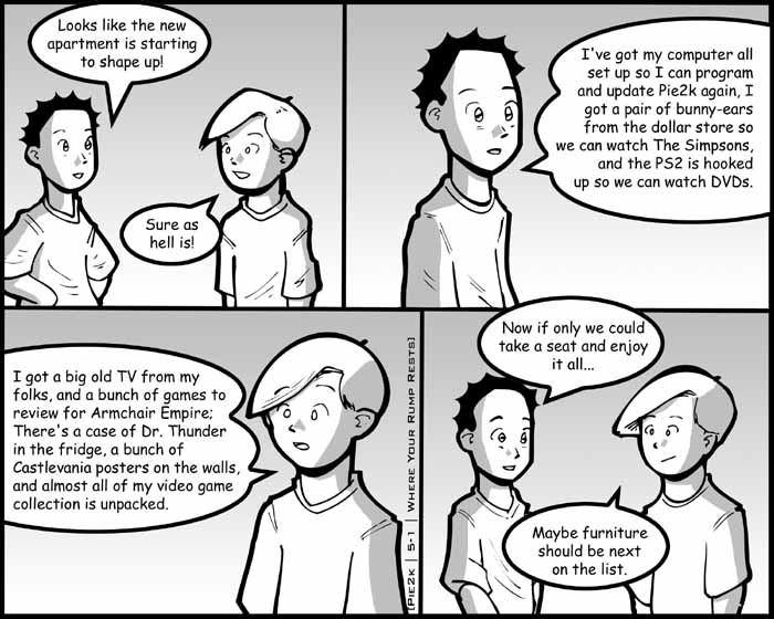 Well, I guess this is as good a time as any to open up a new chapter in Pie2k. It really is a new chapter in my life... though I've been out of school for about 5 months now and I've been living without my parents' support for quite a while. I guess the thing that makes this different is that a lot really does rest on my shoulders right now... from rent to impending car insurance to the phone bill... there's a lot of loose ends for me to take care of.
