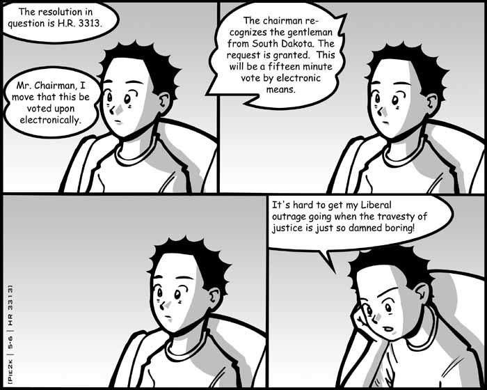 Right off the bat, I'm ranting about House Resolution 3313. Now, let me preface this by saying that I almost never watch CSPAN. It's slow, boring, and the overly restrictive and cumbersome rules of Congress typically make the proceedings more or less incomprehensible to the common viewer. Granted, I understood the basics of the debate portion (pro gets a time limit, con gets a time limit, there is one main speaker for each side, he or she can yeild his or her time to other speakers to make their arguments, etc...), and got a lot out of it, but the actual intermediate steps and voting portions were nearly incomprehensible.