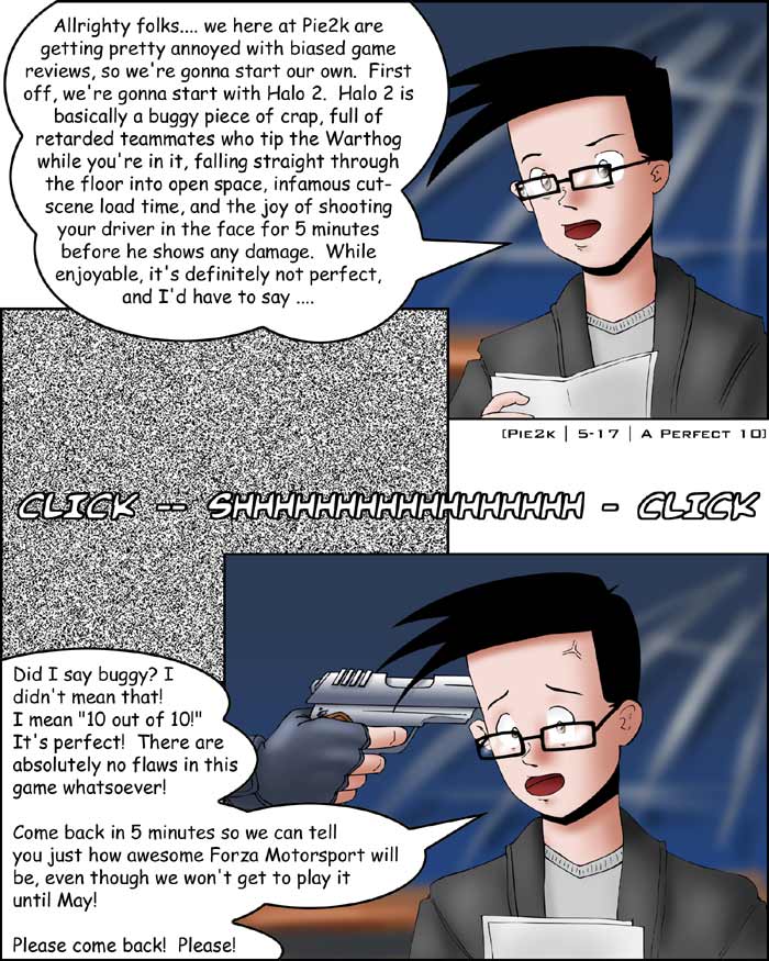 Anyhow, as you can tell from the strip, I'm really pissed that so many people gave Halo 2 a perfect score. Now, it's no secret that I'm not the biggest fan of first-person shooters, but watching Commie play this made me realize that I wasn't crazy. See, I'm not mad that Halo 2 is getting good scores. It's more or less decently put together, and I can honestly say that I've played worse. My issue is that it basically got perfect scores across the board. Every major magazine gave it a perfect score. Just about every magazine gave it FPS of the year. Many gave it game of the year.