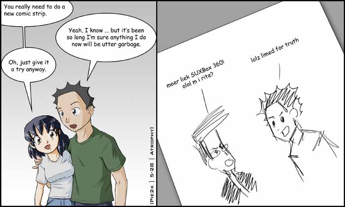 I think this has been, by far, my longest dry spell between comics. In case you don't want to do the math, it's been about 2 1/2 months. I wish I could say that there was some legitimate reason that I had been so lax in updating. The reality is that I've gotten out of the habit, and reasonably lazy on top of that.
