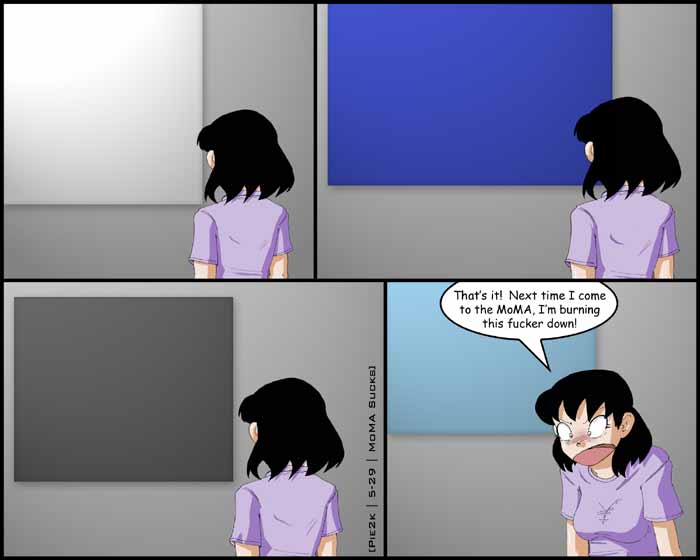Whee! This update took less than a month! I know I'm shocked. The idea for this strip came from Beth and I visiting the MoMA to see the Pixar exhibits. When I show 4 paintings that are just solid color, it's no exaggeration. Seriously, they actually put this shit up and call it art. We saw 4 paintings like that (blue, white, black, and teal), which is pathetic enough. The kicker, though, is that each one is done by a different artist. See, I could understand the first guy saying "hey, let me try this out and see if I can get away with it," but the 3 that came after him should've just been led out in front of the firing squad.