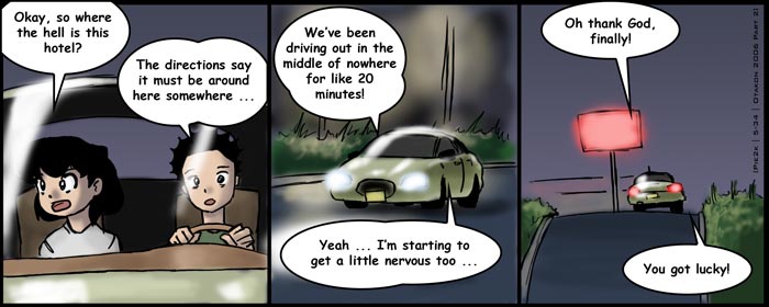 Anyhow, I know that an Otakon strip after all this time is a little disappointing, but the idea was already in place and it let me fire one off while I try to re-think things. This is yet another one of those "funny but true" moments ... Beth and I tried a new hotel outside of the city this year ... but finding it was quite a chore. It was effectively hidden within a corporate park. And, even though it was exactly where Google said it would be, it was hidden from view until you crested the final hill. A few times along the way Beth and I were convinced we were totally lost but we got there just fine.