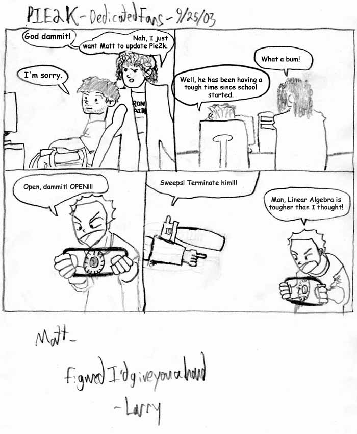 I know I've been psychotically delinquent. I'm really sorry, and I hope to have a few strips up soon. Meaning... I hope to have a few strips drawn by me up soon. Larry and Rasa may be some of the most dedicated fans out there, but I can't exactly let them take over. :P