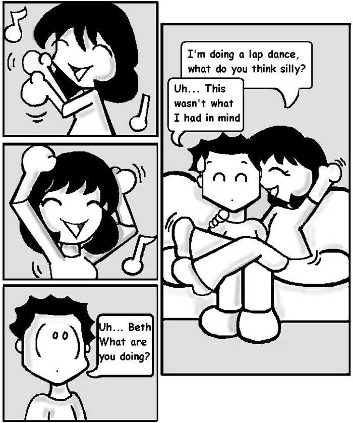 This here is Beth's guest strip. I told her I put it up, but I'll probably have to remind her in the morning seeing as how she's sleeping right now. (she's especially cute when she sleeps!) I don't have any links to give you for Beth's sites right now, but when I get some, I'll add them.
