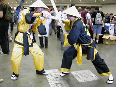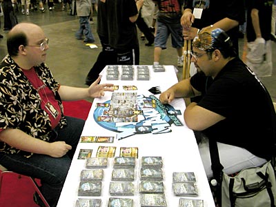 On the first day we went to the dealers' room and found this guy giving out Yu Yu Hakusho CCG demos. Unfortunately, he couldn't sit still for more than 3 milliseconds between snapping photos of girls in costume. Fun at work, I guess.