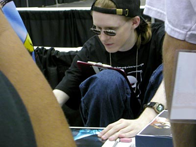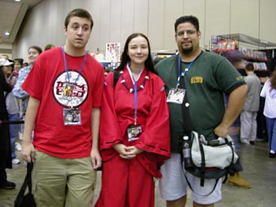 And this is a shot from the last day of the con. As we waited in line to meet the Megatokyo folk, Bill, Corey, and I made a line buddy. She's from Kentucky, and was commenting on how boring it is during the summer when she's not at Otakon. I figure Kentucky and Tennessee border each other (I think, too lazy to look at a map), so she should meet up with Katie at some point and talk about anime or something.