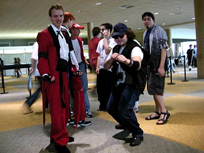 Right into the convention hall Rasa, dressed as Clark, found a bunch of other King of Fighters cosplayers. Here's their picture. They would rock if they weren't so apathetic. Rasa: "Wanna pose with me for a picture?" Guys:"Meh"