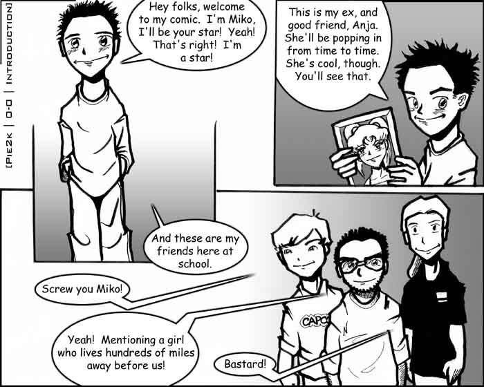 Okay, so here it is, the first ever Pie2k comic strip. It's called "Introduction" and, although it doesn't really act well as an introduction, I think it's still pretty cool. It's just a way to stick a bunch of characters in right at the start. Screw development... my philosophy is "here are some characters... enjoy!"