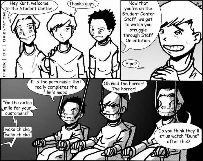 But, at any rate, the Student Center isn't that bad of a place to work, it's just got a ton of annoying qualities. Student Orientation, with its ice-breakers and training films, ranks high on that list. So does Tamika Quick... who hopefully isn't reading this 'casue she'll just be quitely pissed at me for ever and actually be ruder than she was (if at all possible). Also annoying are the times of long, sustained, blank-faced staring. Even in Info-systems, which is usually a very busy office, we occasionally get periods where we must stare off into space to occupy our time. Nothing like sitting there trying to actually feel the crust build up in the corners of your eyes.