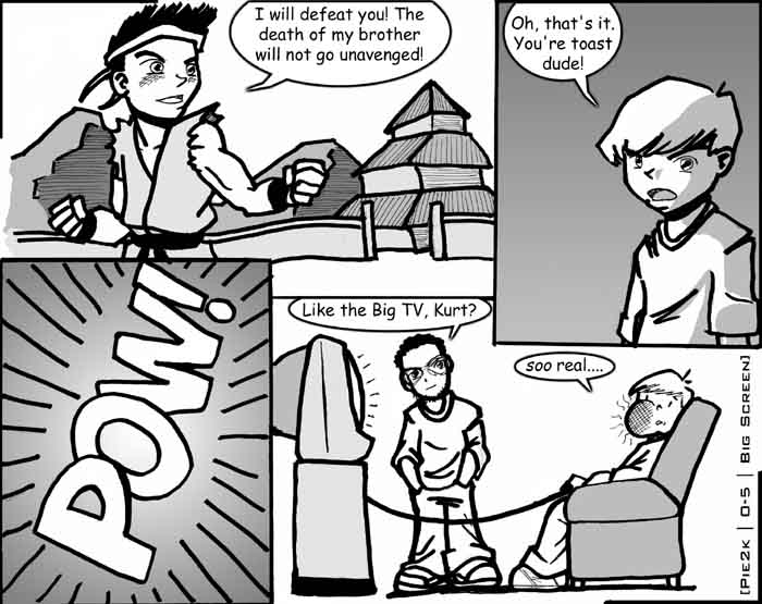 So, on a Sunday afternoon, with no real confirmation as to whether this thing was thrown away or not, we wheeled the 400lb TV on its aluminum stand and caster wheels across campus, on concrete, and down steep hills... Damn near broke our necks. When we got the thing in and hooked up Soul Calibur via the VGA cable though... it was so worth it.