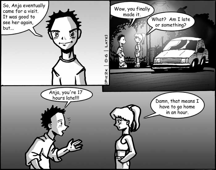 Okay, so here's another strip where I rag on Meg via Anja. This actually refers to a specific incident. Meg didn't tell Tryon when she was gonna show up on campus, so Tryon figured it would be a good idea to guess.