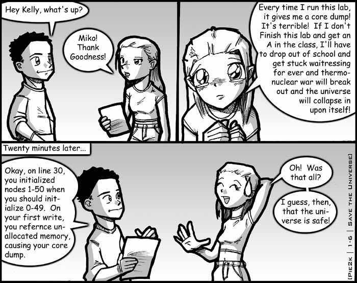 For those of you who don't know Kelly (but then again, who reads this and doesn't know Kelly? Maybe Jon, or DJ? That's about it.), she has a knack for freaking out when she has an error she can't find in her C++ assignments. And then she goes into Super Kelly Panic Exaggeration Mode®. A scary thing, I assure you, as you start to believe that were she ever to fail a single assignment, the world would come crumbling down.