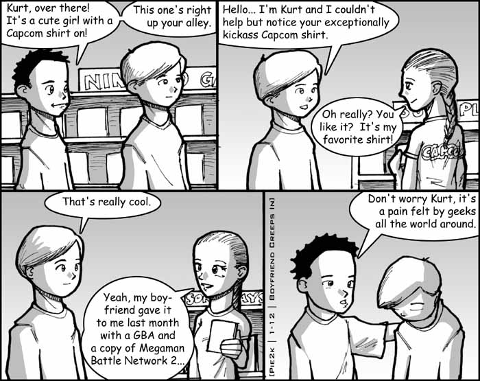 Basically, what I'm trying to do in this comic, assuming I have some sort of artistic intent, is to demonstrate a situation that almost every guy has been in, and I suspect many girls have been in too (reversed, of course).