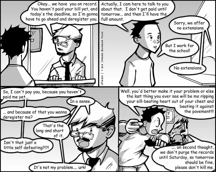 I didn't walk away angry that day. A little nervous, yes, but not angry. The clerk was very polite to me,... basically told me what you see verbatum in the last panel when I first asked for a one day deferrment. He pointed out that it was a deadline that wasn't strictly enforced because of the weekend purging policy. His politeness and niceness were totally false and you could tell it was an act... but he put a lot of effort into it and I'm a sucker for good customer service.
