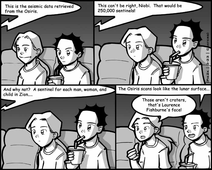 70 mm film + 4 story screen + Laurence Fishburne's face = lunar surface. Seriously, he's got a lot of pock marks and craters on his face. I'd seriously be inclined to believe that he's a recovering burn victim. The only other person I've ever seen with skin that bad in a movie was Orlando Bloom in The Fellowship of the Rings. It's just a little harder to notice, since they seemed to use shalac as his makeup.