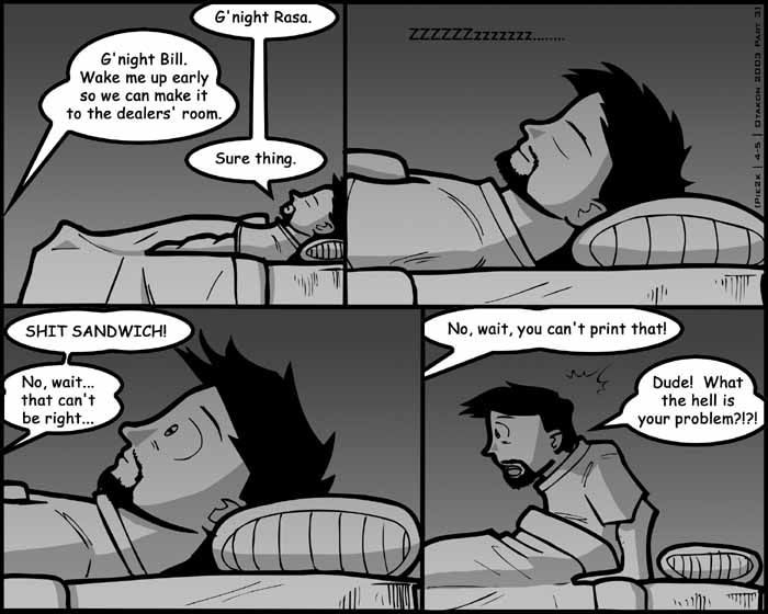 Well, my life is pretty boring, and I've ranted 3 other times this week, so I don't have much to write. Back again tomorrow with another Otakon comic. Unfortunately, I'll run out of templates by the end of the weekend, so I'll (gasp) have to measure one out manually... so maybe I'll throw in one with an odd layout now that I have the chance. We'll see.