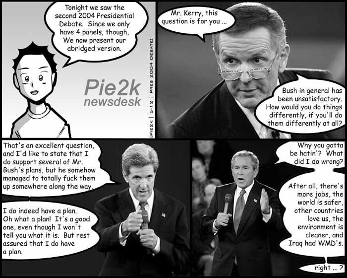 So the debates were tonight... and Kerry kicked ass. I don't care what you think. You'd have to be blind and deaf to believe that Bush actually debated better. Kerry tore him apart (again) and spit him out. The only problem I have with them is that Bush keeps talking about a bunch of more or less "sore points," where he's totally wildly off base, and Kerry doesn't hit him where it hurts. Here are some examples.