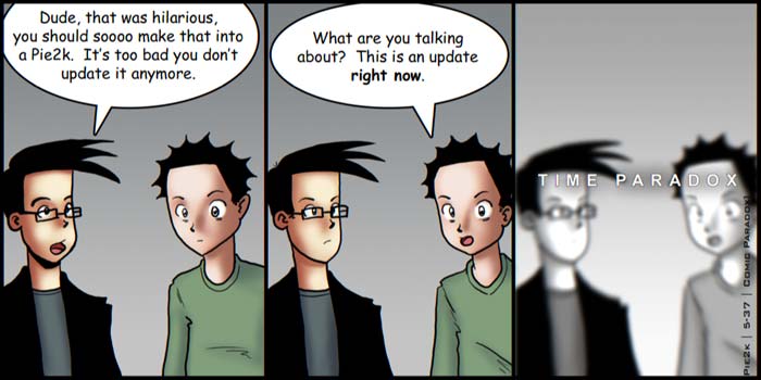 Well, I'm shocked too. 4 updates in 4 weeks. I guess Mac Hall really did wake me up a little. I don't know if I'm going to accelerate my pace with the Pie2k updates or just try to maintain, but I'm certain that I don't want to go back to monthly (or occasionally bi-monthly) updates. I've also been thinking that it's been about a year and a half since the last site redesign, so it might be about time to change the look around a bit. I've been doing redesign stuff at work recently, so I'm kind of "in the groove" for redesigning stuff.