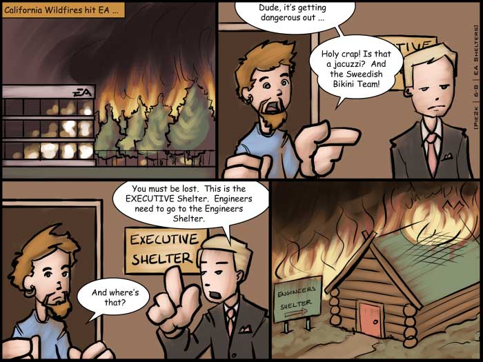Today's comic is a bit of insider baseball, so to speak. EA's got a pretty bad track record when it comes to treatment of average joe workers vs. treatment of upper management. But then again, so does every other company on the planet. Specifically though, since they're bleeding cash, they're worth less than normal and therefore at risk for a hostile takeover. As such, the executives created a plan that would ensure that if that happened and the new corporate overlords wanted to shake things up, the executives would be nicely compensated and have their benefits extend for 18 months past termination What got at me was the name: "Key Employee Continuity Plan." Apparently, EA thinks the "key" employees aren't the ones who actually make the games.